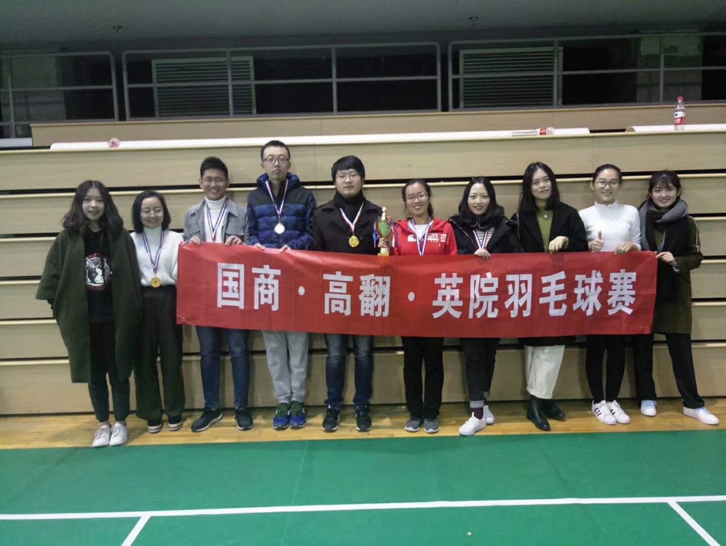 ——女双比赛中,英院对战高翻,英院队员王臻、朱芸团结协作,紧密配合,在第一局失利的情况下,及时调整,敢打敢拼,连赢两局,以2:1获胜。在与国商的比赛中,英院选手再续优势,配合默契,以2:0轻松获胜,将金牌收入囊中。
