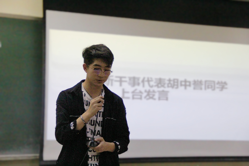 随后,新干事代表胡中誉同学上台发言。怀着加入团学联的荣幸,他承诺,作为团学联新成员,要严格要求自己,在保证个人学业顺利进行的同时要不断增长见识,培养各方面能力。最后他用自信的态度作结,代表全体新干事表达了对未来在团学联工作学习的期待。